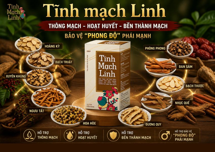 Thay vì lo lắng về việc phẫu thuật, nhiều nam giới đã tìm đến giải pháp Đông y để củng cố sức khỏe tĩnh mạch. Tĩnh Mạch Linh của Dược phẩm Khang Linh chính là lựa chọn hàng đầu hiện nay. Sản phẩm được phát triển dựa trên bài thuốc cổ phương, tập trung vào nguyên lý "Thông mạch - Hoạt huyết - Bền thành mạch".
